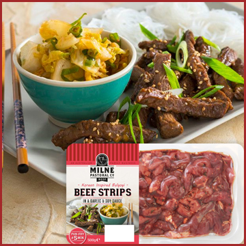 Our beef strips are in a Korean inspired garlic and soy sauce. It’s a family friendly flavour similar to a mildly seasoned gravy. Serve over rice or noodles for a 5 minute feast!
